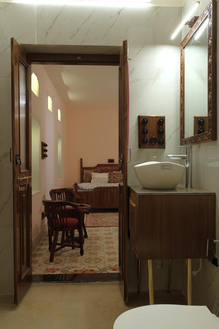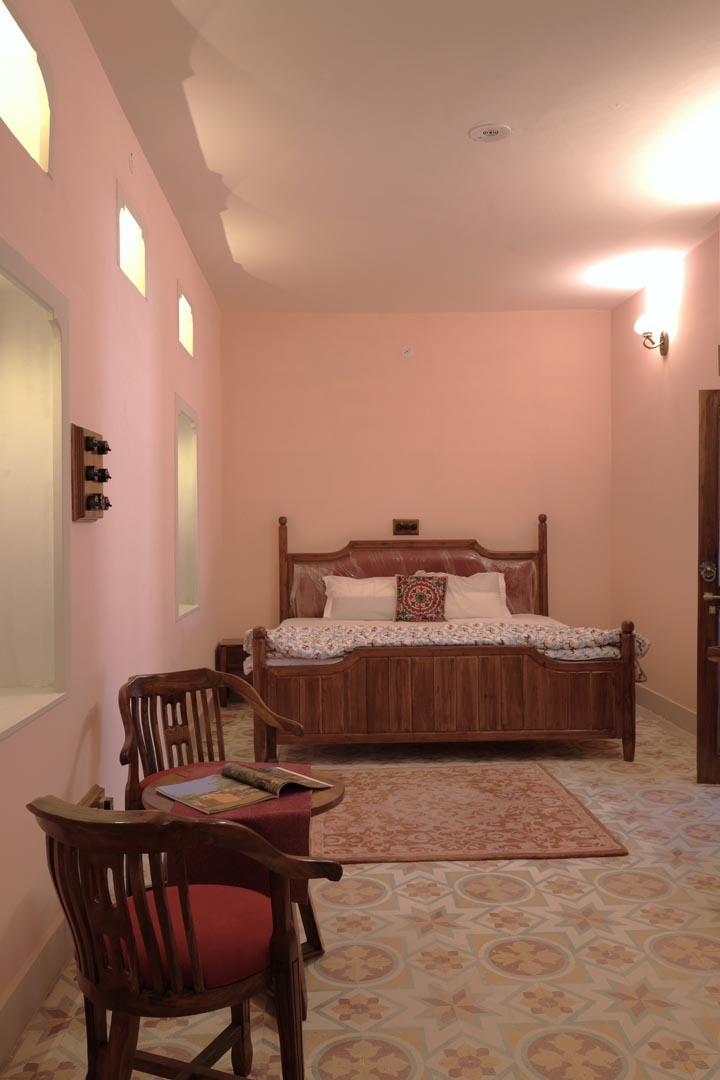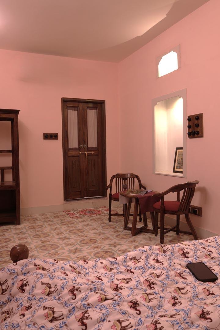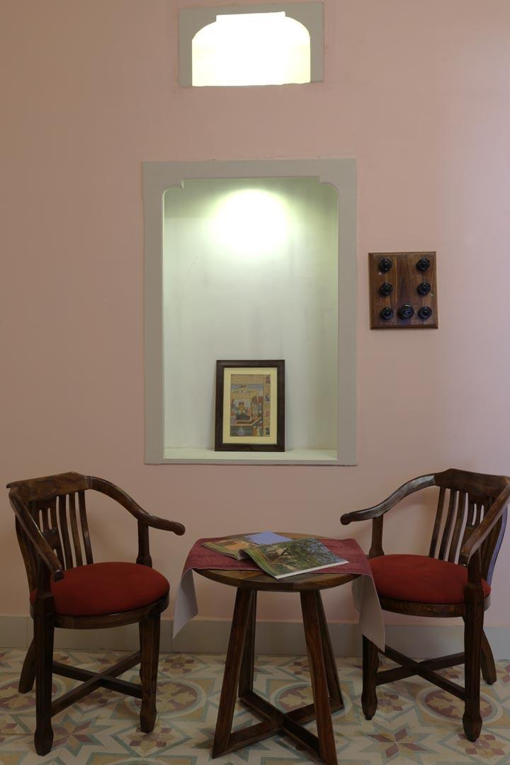 Authentic Rajasthani Decor – Hand-painted walls, antique wooden furniture, and royal paintings